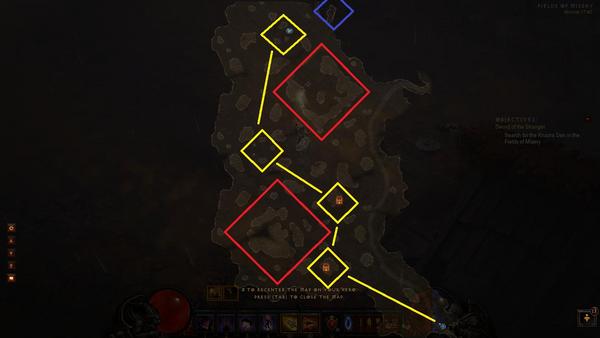 玩家可以选择异世之剑这个任务,然后从悲惨之原的存储点开始沿着图中的标注路径寻找。