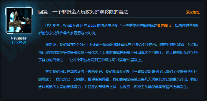 在2.2.0补丁上线时,PTR中引人注目的野蛮人神器“莫提克护腕”被移除,而且在第一版的补丁列表中也没有很好的体现。这一改动在社区中掀起了巨大的反对声,很多玩家批评暴雪在这个问题上的处理。不过随着这两天热度的慢慢平息与 Wyatt 的访谈,玩家们开始冷静的对此讨论。今日社区经理 Nevalistis 发表了一篇“检讨”蓝贴,谈了谈移除莫提克护腕的缘由,并且对玩家进行诚挚**。