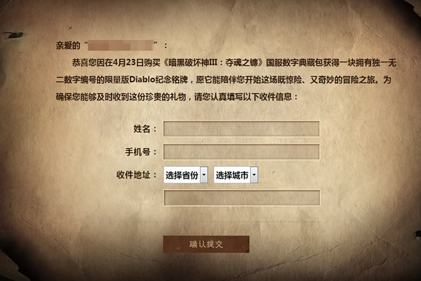 在这里,我们再次提醒广大玩家:领取铭牌的邮件由网易战网运营团队邮箱发出,提交快递信息的页面网址亦在官网主域名(http://www.diablo3.com.cn)下,请确认无误后再填写。