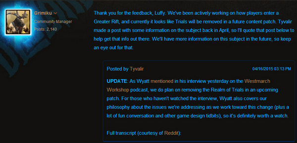 感谢你的建议,Luffy。我们正积极的对玩家如何进入大秘境的方式进行改进,目前看来试炼会在未来的一个内容补丁中移除。Tyvalir曾在四月发帖就这个话题与大家分享了一些相关信息,我也在下面贴出供大家了解。关于这个问题我们会在后续为大家带来更多信息,所以保持关注。