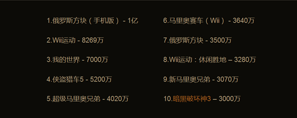 维基百科统计的电子游戏销量排名前十: